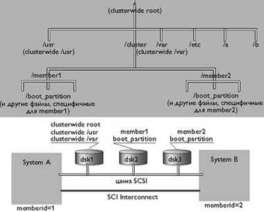 Важнейшими компонентами организации единого управления системой являются технологии корпоративных кластеров Compaq и система управления ресурсами. В AlphaServer SC используются такие ключевые технологии, как кластерная файловая система CFS, лежащая в основе построения корпоративных кластерных систем Compaq. Эти системы прошли долгий путь развития от пионерских разработок VAX-кластеров до современных систем, которые базируются на технологиях Alpha и Tru64 Unix и получили название TruCluster. Именно CFS и поддержка ее операционной системой составляют фундамент для построения программного обеспечения системы интегрированного управления SC.