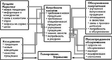 Ныне известную концепцию CRM (customer relationship management - управление взаимоотношениями с заказчиками) можно считать тесно связанной с CSRP. Концепция CSRP основана на расширенной трактовке понятия «Потребности» клиентов. В отличие от обычной для MRP II - ERP трактовки данного понятия [3] как списка товаров, которые необходимо произвести и вытекающего из него списка материалов и компонентов, которые необходимо закупить для реализации процесса производства, CSRP рассматривает потребность неотрывно от жизненного цикла товара, включающего как производство так и послепродажное обслуживание, а также циклы маркетинга и разработки нового товара. Естественно на всех этапах важное внимание уделяется обслуживанию покупателей и максимальному удовлетворению их потребностей. Такой подход полностью согласуется с концепциями CRM и Supply Chain. На рис. 1 схематически представлены компоненты новой концепции производственного управления.