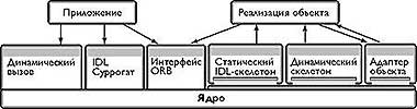 В этом случае, с кодом приложения компонуется библиотека, обеспечивающая обращения к ORB на этапе исполнения и обеспечивается взаимодействие ORB и реализация объекта посредством объектного адаптера (Object Adapter), специфичного для конкретной реализации объекта. Для обеспечения динамических обращений стандарт CORBA предусматривает наличие специальной службы, интегрированной в ORB, - хранилища интерфейсов (Interface Repository - IR). Эта служба обеспечивает хранение IDL интерфейсов объектов в форме, пригодной для использования во время исполнения программ. Наличие этой службы позволяет приложению обращаться к методам даже таких объектов, о существовании которых не было известно на этапе компиляции.