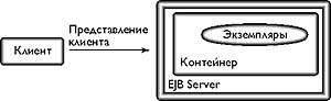 Архитектура Enterprise JavaBeans (EJB) [3], предложенная компанией Sun Microsystems, является наиболее близкой по идеологии к CORBA и предназначена для построения распределенных объектно-ориентированных приложений. Основное отличие состоит в том, что в качестве языка программирования используется Java [4] и не предусмотрены отображения интерфейсов объектов в какие-либо другие языки. Соответственно, подразумевается, что функциональная часть системы будет изначально разрабатываться (или уже разработана) на Java, однако, потребителем не обязательно является Java клиент: спецификацией предусмотрены различные шлюзы, в том числе и для доступа по протоколу IIOP. Обращение клиента к реализации объекта осуществляется не напрямую, а посредством EJB сервера, сходного по своей функциональности с ORB в стандарте CORBA. В работе [3] приводится схема системы, построенной по технологии EJB, которая, для полноты изложения, представлена здесь на рис.3.