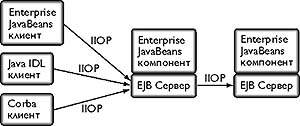 Для построения распределенных систем, спецификацией EJB предусмотрены механизмы взаимодействия EJB серверов между собой и механизмы для распространения информации об имеющихся enterprise beans: служба Java Naming and Directory Interface (JNDI). Кроме того, EJB изначально предусматривает механизмы построения распределенных систем, основанные на протоколе IIOP, что подтверждает желание разработчиков стандарта обеспечить максимальную совместимость с CORBA. Схема подобной распределенной системы приведена на рис.4.