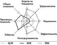 Результаты проведенного специалистами Gartner Group сравнительного анализа эффективности средств оперативной обработки транзакций (OLTP) мэйнфреймов и промежуточного ПО обработки транзакций TPM и OTM приведены на рис.2.