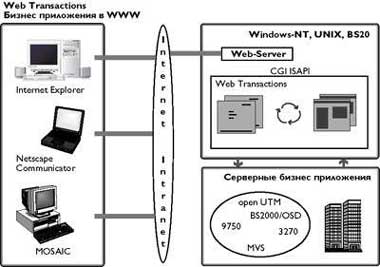 Связь с World Wide Web через сервис WebTransactions обеспечивает стандартизованный доступ различных групп пользователей к серверным приложениям и данным из OSD, MVS и открытых UTM систем. WebTransactions представляет собой программу, которая вызывается через интерфейс CGI (Common Gateway Interface), поддерживаемый Web-сервером. CGI-программы взаимодействуют с сервером через HTML формат, который может быть интерпретирован браузером.