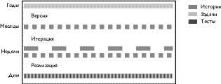 Рис. 2. ХР соотносится с различными шкалами времени В масштабе месяцев и лет мы имеем дело с историями данной версии системы и затем с историями будущих версий. В масштабе недель и месяцев мы имеем дело с историями данной итерации и затем с историями, оставшимися в данной версии. В масштабе дней и недель мы имеем дело с задачей, над которой работаем в данный момент, а затем с задачами, оставшимися в итерации. Наконец, в масштабе минут и дней мы имеем дело с тестом, который прогоняем в данный момент, и затем с оставшимися тестовыми примерами, которые, возможно, придут нам в голову. |