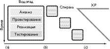 Рис. 1.Эволюция подходов к программированию от модели «водопада» (a) с ее длинным циклом разработки (анализ, проектирование, реализация, тестирование) к укороченным, итеративным циклам разработки, как, например, в спиральной модели (b) и, наконец, к модели экстремального программирования (ХР, c), в соответствии с которой, за небольшой промежуток времени понемногу выполняются все операции цикла, и так на протяжении всего процесса разработки. |
