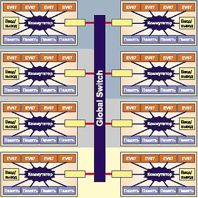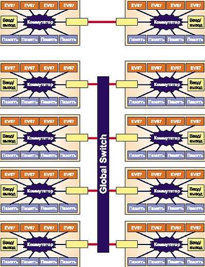 Компьютерной индустрией опробованы разные параллельные архитектуры, среди которых наиболее широкое распространение получили SMP и MPP. Развивались различные подходы к построению многопроцессорных систем, способы работы с памятью и варианты взаимодействия частей машины между собой. Так, при использовании UMA (Uniform Memory Access) вся память является единой для всех процессоров, каждый из которых имеет одинаковый доступ к любому участку памяти, а для NUMA (Non-Uniform Memory Access) память и процессоры разделяются на логические блоки для уменьшения суммарного трафика. У обоих подходов есть свои плюсы и минусы. Поэтому в Compaq пошли по иному пути, взяв за основу архитектуру NUMA, но сделав возможным работу в режиме UMA. Кроме того, поддерживается возможность динамически перераспределять ресурсы между несколькими образами операционных систем, одновременно работая и как MPP-, и как SMP-машина.