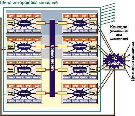 В дополнение система снабжена хорошо резервируемой подсистемой консолей, которая также не является критичным компонентом. Сервером можно управлять с системной консоли, непосредственно подключенной, например, к последовательному порту, или удаленно посредством соединения TCP/IP.
