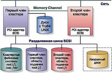При создании кластера процедура установки копирует файловые системы Tru64 UNIX root (/), /usr и /var с диска Tru64 UNIX на выбранные администратором диски. Рекомендуется для общекластерных файловых систем использовать диски, размещаемые на системной шине SCSI, так, чтобы к ним могли обращаться все члены кластера.