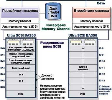 На рисунке 2 представлена минимальная конфигурация, в которой отсутствует дисковое пространство для приложений высокой готовности. Начиная с версии Tru64 UNIX Version 5.0, шина SCSI поддерживает 16 устройств, в силу чего на одной и той же шине теперь можно размещать множество модулей хранения BA356, что позволяет подключать большое число устройств.