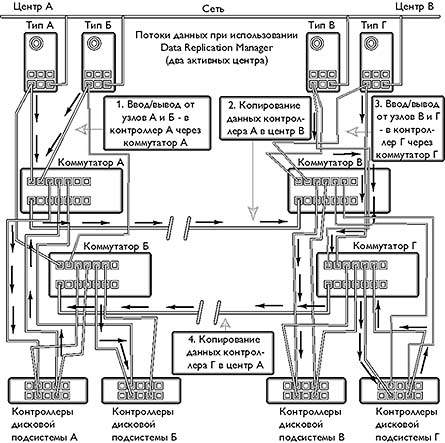 - Смешанная нагрузка. Приложения работают в обоих центрах, но это разные приложения, часто обслуживающие разных пользователей. Все или только некоторые диски зазеркалированы между центрами. Нагрузка на сеть определяется, в основном, процессом зеркалирования при записи на диски. Она существенно выше, чем в предыдущем случае. При выходе из строя одного из центров вся обработка данных происходит в другом центре. На компьютерах сохранившегося центра осуществляется запуск (или активизация) приложений, работавших в вышедшем из строя центре.