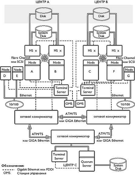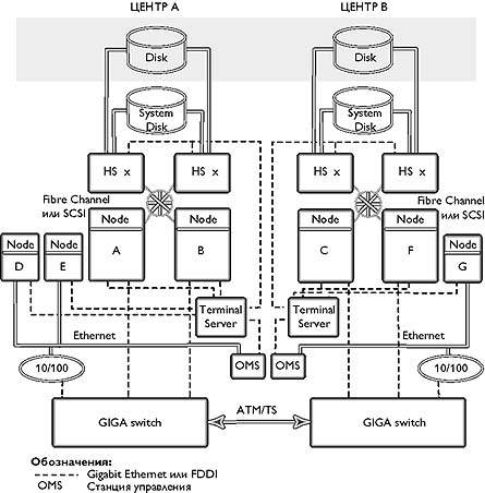 Центры могут быть соединены каналами Gigabit Ethernet, FDDI, ATM/SONET или T3/SONET, в зависимости от требуемой пропускной способности и необходимого расстояния. Компьютеры соединены между собой через расширенную локальную сеть (ELAN) путем подключения к каналам, соединяющим центры, через маршрутизаторы или коммутаторы, например, GIGAswitch. Для подключения членов кластера к коммутаторам следует использовать Fast или Gigabit Ethernet, а также FDDI.