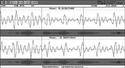 Находит свое экспериментальное подтверждение и гипотеза о проявлении индивидуальных особенностей голоса диктора в векторе начальных фаз узкополосных составляющих вокализованных участков, рассчитанных по формулам (2) и (3) и приведенных к одной выбранной опорной. Как известно фазовые соотношения спектральных составляющих речи, слабо влияют на ее слуховое восприятие и трудно поддаются математическому расчету, поэтому в ранних исследованиях по речевой обработке на них не обращали особого внимания. Действительно, если речевой сигнал просинтезировать только по изображению его сонограммы, над которой не было произведено никаких действий, и без учета значений мгновенных фазовых спектров, а только восстанавливая при синтезе закон изменения полной фазы без учета ее начального состояния, то звучание, узнаваемость и разборчивость нового, так созданного, звукового сигнала будут абсолютно неотличимы от исходного при корректно проведенных расчетах. Волновая же форма нового сигнала может быть совершенно другой по отношению к исходной осциллограмме.