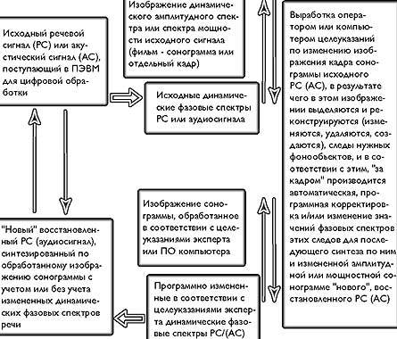 С помощью описанного подхода в процессе взаимодействия человека и компьютера на долю первого приходится лишь творческий процесс обработки звука и речи, представленных в виде графических образов. Этот процесс, сходен с работой художника-ретушера, улучшающего качество искаженных или зашумленных фотографий (кадров), вырезающего и обрабатывающего нужные участки, делающего необходимые пометки в кадре и т.п. Любое изменение изображения графического образа речи тут же приводит к синтезу нового речевого сигнала, изображение амплитудного спектра которого адекватно соответствует измененному графическому образу динамической спектрограммы.
