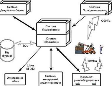 Система управления контейнерным терминалом (рис. 2) состоит из подсистемы документооборота и подсистемы управления, использующей для своей работы систему позиционирования (GPS), систему электронной идентификации, комплект радиооборудования и электронные табло. Система документооборота разрабатывается службой информационных технологий ПКТ и предоставляет средства централизованной подготовки документов, хранения большого объема документации и быстрого доступа к информации.