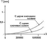 Здесь t - время реакции системы на запросы пользователей, k - количество индексов в базе. Из рисунка видно, что для обработки запроса с одним ключевым словом требуется меньше времени, чем для поиска по двум ключевым словам, причем это особенно заметно при больших объемах базы. Кроме того, следует отметить, что время реакции системы также зависит от технического обеспечения сервера и интенсивности обращений.