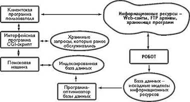 Программа - робот независимо от других подсистем регулярно, один или два раза в неделю составляет индексы и по указанным информационным источникам (Web-серверам, FTP-архивам, хранилищам программ и т.д.) создает исходную базу данных - образы информационных ресурсов. Эти образы включают в себя ключевые слова, встречающиеся в документах, файлах и т.д., а также их URL-адреса.
