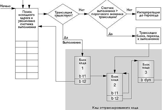 Когда Aries начинает эмуляцию приложения PA-RISC, он вызывает интерпретатор для эмуляции команд. Интерпретатор интерпретирует по одной команде до тех пор, пока не достигнет перехода. Он вычисляет адрес перехода и возвращает его модулю времени исполнения Aries. Модуль времени исполнения ищет возвращаемый адрес перехода в таблице соответствия адресов, чтобы определить, оттранслировал Aries или нет адресуемый блок в динкод (оттранслированный код, содержащий «родные» команды IA-64). Если это так, модуль времени исполнения Aries передает управление соответствующему динкоду и непосредственно выполняет его. Если блок не был оттранслирован, модуль времени исполнения определяет, готов ли адресуемый блок к трансляции. Если он не готов, модуль времени исполнения Aries увеличивает счетчик выполнения для данного блока и возвращает управление интерпретатору. Если блок достиг порогового значения трансляции, модуль времени исполнения Aries вызывает транслятор и порождает динкод. Затем Aries сохраняет этот динкод в выделенном кэше транслированного кода для последующего его использования |