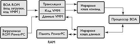 В BOA двоичная трансляция прозрачна. Как показано на рис. 1, при загрузке BOA управление передается менеджеру виртуальных машин (virtual machine manager - VMM), который реализует систему двоичной трансляции. VMM - это часть микропрограммы BOA, хотя и невидимая для программного обеспечения, которое работает на этой архитектуре.