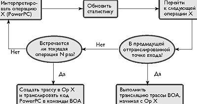 Рис. 3 показывает, как работает BOA. Как только BOA видит, что трасса встречается большее число раз, чем предусмотрено пороговым значением, он ассемблирует код, начиная с точки входа в трассу PowerPC и транслирует его в трассу команд BOA для выполнения на базовом аппаратном обеспечении. В каждой точке перехода BOA следует по наиболее вероятному пути. Как только трасса во время трансляции достигает условного перехода, вероятность достижения каждой точки с начала трассы уменьшается. Когда вероятность опускается ниже порогового значения, BOA завершает трассу.