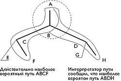 | Рис. 2. Формирование трассы вдоль пути ABDH. Эффективное окно операций может оказаться небольшим, если интерпретатор некорректно предскажет наиболее вероятный путь при выполнении группы операций PowerPC. Пунктирный круг показывает, как эффективное окно операций обрезается до пути AB из-за ошибочного предсказания пути, вместо того чтобы охватывать более длинный путь, такой как ABDH или ABCF |