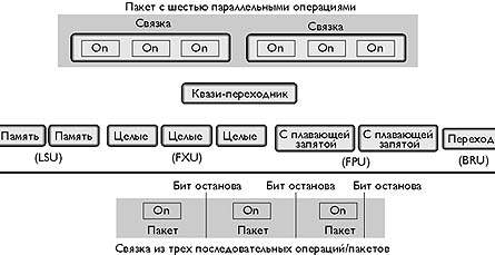 Как показано на рис. 5, генерация кода гарантирует, что между операциями в пакете нет никаких зависимостей, поэтому они могут без опасений выдаваться параллельно. Шесть слотов выдачи могут содержать операции, предназначенные для девяти различных устройств исполнения: два устройства памяти, два устройства для целочисленных операций, два для операций с плавающей запятой, и одно для переходов. В пакете может выдаваться любая комбинация операций, но чтобы упростить декодирование и рассылку команд, в пакете операции должны кодироваться в этом порядке.