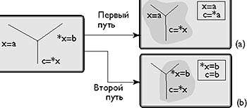 | Рис. 4. Динамическая оптимизация может открыть новые возможности оптимизации. На рисунке (a) создание копии порождает две независимых операции, которые могут быть запланированы в той же самой VLIW. На рисунке (b) наложение загрузки - сохранения удаляет зависимости через память. Создание копии c = b может открыть еще большие возможности |