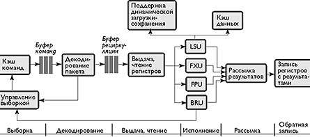 | Рис. 6. Процессор BOA выполняет команды одновременно в двух устройствах загрузки-сохранения (LSU), четырех устройствах для операций с целыми числами (FXU), двух устройствах для операций с числами с плавающей запятой (FPU) и устройстве выполнения перехода (BRU) |
