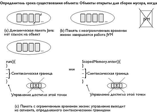| Рис. 1. Как неограниченная по времени и ограниченная по времени память отличается от других методов указания срока существования объекта. (a) Динамическая память Java использует автоматическое резервирование, при котором видимость определяет срок существования объекта (если нет ссылок на объект, система может его освободить). Автоматическое резервирование требует использования сборщика мусора, который порождает задержки. (b) При резервировании, использующем память с неограниченным временем жизни RTSJ, срок существования объекта заканчивается только тогда, когда завершает работу виртуальная машина Java (JVM). (c) Память с ограниченным временем жизни RTSJ использует синтаксические границы, определяющие области памяти особого типа, находящиеся вне динамической памяти, подвергающейся сборке мусора, что позволяет управлять объектами с четко определенным сроком существования. Когда управление достигает определенной точки в логике, система удаляет все объекты, размещенные в данном сегменте памяти, и вызывает модули завершения |