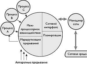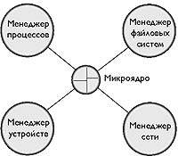 Микроядро отвечает за такие жизненно важные функции, как средства межпроцессного взаимодействия и низкоуровневый сетевой обмен, диспетчеризацию процессов и первичную обработку прерываний (рис. 2).