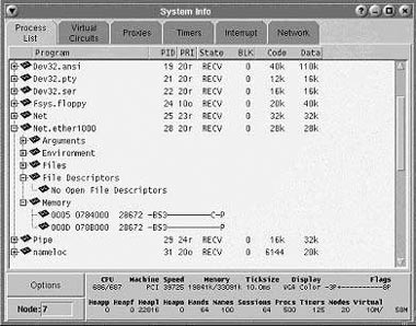 SID PID PROGRAM PRI STATE BLK CODE DATA — — Microkernel—-——- —- 104480 0 1 sys/Proc32 30f READY —- 118k 802k 0 2 sys/Slib32 10r RECV 0 53k 4096 0 4 /bin/Fsys 29r RECV 0 77k 1482k 0 5 /bin/Fsys.eide 22r RECV 0 61k 114k 0 8 idle 0r READY —- 0 40k 0 16 //11/bin/Dev32 24f RECV 0 32k 94k 0 21 //11/bin/Dev32.pty 20r RECV 0 12k 32k 0 22 //11/bin/Pipe 10r READY —- 16k 32k 0 24 //11/bin/Net 23r RECV 0 32k 73k 0 26 //11/bin/Net.ether1000 20r RECV 0 28k 28k 0 28 //11/bin/nameloc 20o RECV 0 6144 20k