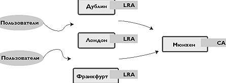 В некоторых ситуациях помимо центрального уполномоченного СА могут понадобиться локальные посредники - Local Registration Authority (LRA), которым СА делегируют некоторые из своих функций (рис. 3). Как правило, LRA отвечают за идентификацию и регистрацию для некоторой группы пользователей. Например, в роли LRA может выступать администратор локальных систем или приложений, который будет проверять, что запрашивающий сертификат пользователь действительно является служащим компании. Без LRA не удастся обойтись в том случае, если инфраструктура PKI развертывается в крупной, географически распределенной организации. Такая организация будет иметь центральную службу СА и несколько LRA для своих филиалов.