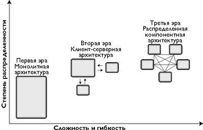 Первая эра - эра эксклюзивного «монолита», когда компьютерные программы, или потом, пакеты программ, выполнялись на одном компьютере. Особого выбора у потенциальных потребителей программных продуктов тогда не было - или сам разрабатывай, или заказывай у опытных людей. Тогдашние операционные системы не баловали богатством возможностей - работает приложение на компьютере - и хорошо. Оно могло работать годами, выполняя раз навсегда закрепленные функции, и все были довольны. Это время часто называют и «эрой мэйнфреймов», хотя именно мэйнфреймы подошли вплотную к «тихой революции». От них появилась возможность приставить к одному серверу несколько «глаз» - терминалов, которые позволили плавно перейти в «клиент-серверную эру». Вот тут то и появляется служака «сервер». Сервер работает, служит, выполняя задания его величества клиента. Клиент от простенького «застенчивого» терминала вырастает до важного и значительного повелителя. Нынешний революционный момент характеризуется тем, что серверы не могут, а клиенты не хотят существовать по-старому. Первые не могут справиться с обилием поставленных перед ними требований, а вторые недовольны качеством обслуживания их запросов. Выход - в дальнейшей специализации. То, что пыхтя и отдуваясь выполняет несчастный сервер, теперь будет распределено на множество серверков - компонентов, каждый из которых успешно выполняет свою функцию. В такой компании клиенты превращаются в равноправные компоненты, чья задача - представительство функциональных сотоварищей (других компонентов) для пользователя, сидящего перед дисплеем.