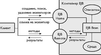 Клиентские приложения общаются с бинами через контейнер, который открывает наружу оба интерфейса бина: Home и Remote. С помощью первого открывается сеанс или находится нужный бин, а с помощью второго - осуществляется отработка действий клиента в Session или транзакционная механика обработки Entity.