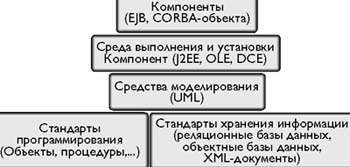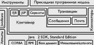 Вскользь упомяну о следующих усилиях по созданию технологии компонентного программного обеспечения, снова связанных с Java. Это J2EE (Java 2 Enterprise Edition) - стандарт для многозвенных систем уровня предприятия, прикладная платформа, обеспечивающая взаимодействие Enterprise Java Beans, Java Server Pages, апплетов и сервлетов. рис. 5 в точности иллюстрирует то, как это выглядит у компании Sun.