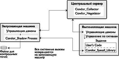 Condor_shadow. Демон, работающий на запускающей машине и выполняющий функции менеджера ресурсов. Все системные вызовы с удаленных машин пересылаются демону condor_shadow, где выполняются, а результаты отправляются обратно удаленной машине и заданию.