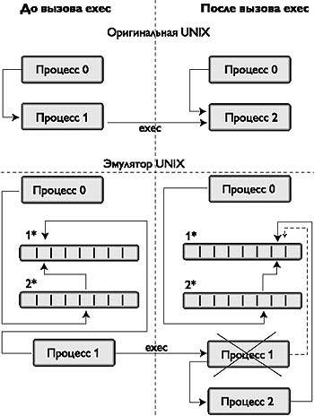 Гораздо проще имитировать exec: достаточно вызвать CreateProcess и «удалить» текущий процесс, имитируя его замещение новым. Остается всего лишь подменить идентификатор нового процесса на идентификатор прежнего. Если этого не сделать, вновь порожденный процесс станет потомком процесса, вызвавшего exec, а в оригинальной системе UNIX функция.exec, не создает дочернего процесса и сохраняет идентификатор текущего. Но идентификатор процесса выдается операционной системой и не может быть изменен по желанию приложения! Другими словами, если «Процесс 0» породил «Процесс 1» и запомнил его идентификатор, а «Процесс 1», имитируя вызов exec, обратился к функции CreateProcess и вызвал exit для завершения своей работы, то «Процесс 0» будет по-прежнему ссылаться на уже несуществующий «Процесс 1», ничего не зная о порожденном «Процессе 2», обладающим иным идентификатором.