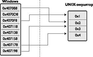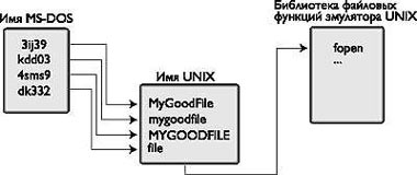 К сожалению, существуют и такие различия, сгладить которые невероятно трудно. Так, например, система UNIX чувствительна к регистру в именах файлов и допускает мирное сосуществование «myfile» и «MyFile» в одном каталоге. Кажется, единственный способ приучить к этому Windows, - реализовать собственную файловую систему, но существуют более простые, хотя и менее элегантные решения. Некоторые эмуляторы ассоциируют файлы с таблицами виртуальных имен, обрабатываемых по правилам UNIX (рис. 6).