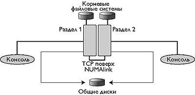 При разбиении NUMAflex-сервера на разделы с переходом к кластерной структуре можно построить классическую кластерную систему высокой доступности (HA). От обычного HA-кластера он будет отличаться высокой производительностью каналов, соединяющих узлы - в качестве них будет использоваться соединения NUMAlink.
