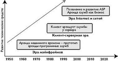 ASP - понятие скорее политическое, нежели техническое. В техническом зеркале ему соответствует альянс наиболее современных технологий, среди которых ведущее место занимают распределенные программные системы, Сервера Приложений и технология CORBA. Через историю развития компьютерных систем легко проследить процесс расслоения единой ткани ПО, выделения служб в отдельную область, что и позволило сформировать новую услугу (рис. 2). Начало следует искать в эпохе мэйнфреймов, когда на основе разделения времени различные организации арендовали машинное время для своих индивидуальных задач. В какой-то мере вычислительные центры можно считать первыми допотопными ASP. В эйнфреймовых приложениях основной упор делался на хранение и извлечение данных, а не на бизнес-логику - управление приложениями.