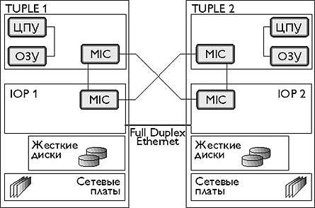 Как показано на рис. 2, система обеспечивает активную избыточность вычислительного элемента (СЕ), процессора ввода/вывода (IOP), жестких дисков, сетевой платы и всего функционально полного комплекса (TUPLE). Интерфейсные платы MIC содержат приемо-передающую часть, для дуплексного обмена данными, и логические схемы, проверяющие идентичность результатов вычислений. Оба вычислительных элемента работают с пошаговой синхронизацией. Если в работе одного из вычислительных элементов будет обнаружена ошибка, второй обеспечит работу пользователей после паузы, не превышающей нескольких миллисекунд и необходимой для исключения отказавшего вычислительного элемента из конфигурации. Система сформирует сообщение об ошибке и переводится в незащищенное состояние с неощутимой для пользователей задержкой. После этого отказавший вычислительный элемент должен быть отключен, отремонтирован и вновь подключен. Система автоматически введет исправный вычислительный элемент в конфигурацию и, используя высокоскоростное соединение, произведет ресинхронизацию работы вычислительных элементов в течение нескольких секунд с минимальным влиянием на работу пользователей.
