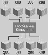 Два модуля QBB могут быть соединены этими портами межсоединения напрямую, что позволяет построить 8-процессорную конфигурацию (модели GS80). Для построения более мощных конфигураций в серверах GS применяется глобальный коммутатор, к портам которого подключаются порты межсоединения всех QBB (рис. 2). К глобальному коммутатору можно подсоединить до 8 QBB, что отвечает максимальной конфигурации в 32 процессора.