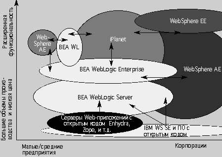 Как показывает приведенная здесь схема, перспективы производителей ведущих продуктов, а также поставщиков решений на базе ПО с открытым кодом зависят также от нынешней ориентации каждой из этих фирм. Дело в том, что представители как одного, так и другого лагеря разработчиков идут разными путями и добиваются успехов в разных сферах, которые можно было бы назвать «центрами притяжения» рынка серверов Web-приложений.