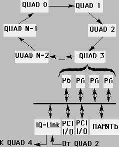 Основная идея архитектуры ccNUMA (cache coherent NUMA) — использование для построения многопроцессорных систем интерфейса между кэш-памятью и основной памятью; термин ccNUMA призван подчеркнуть увязку механизма работы кэш-памяти вычислительного модуля с доступом в удаленные блоки памяти других модулей. Протокол когерентности типа MESI обеспечивает механизм поддержки когерентности кэш-памяти и удаленной основной памяти. Время доступа процессора в собственную локальную память в несколько раз меньше, чем время доступа через коммуникационную сеть в память другого вычислительного модуля. Варианты построения таких систем достаточно разнообразны. Для конкретности можно рассмотреть реализацию NUMA Q2000 компании Sequent, которая построена из стандартных модулей, включающих до 4 процессоров Pentium Pro. Каждый вычислительный модуль помимо процессоров содержит память емкостью до 4 Гбайт, два моста «шина Р6 — шина PCI» и адаптер IQ-link, реализующий протокол когерентности, а также входной и выходной линки (рис. 1.).