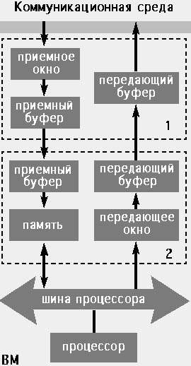 | Рис. 4. Архитектура с рефлексивной памятью Каждый вычислительный модуль содержит процессор, блок памяти, шину памяти и адаптер коммуникационной среды. Адаптер состоит из приемо-передающей части коммуникационной среды (1) и приемо-передающей части процессора (2) |