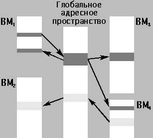 Совокупность страниц локальной памяти модуля делится на две группы: локальные неразделяемые страницы и глобальные разделяемые. Рефлексивная память образуется из всех распределенных по различным блокам физической памяти глобально разделяемых страниц памяти, отображенных в глобальное разделяемое адресное пространство (рис. 5).