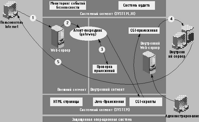 1. Браузер посылает HTTP запрос 2. Web-сервер вызывает CGI-скрипт или Java-приложение 3. Агент-посредник (gateway) осуществляет проверку CGI-скрипта или Java-приложения 4. Агент запускает проверенный («реальный») CGI-скрипт или Java-приложение, которые непосредственно получают доступ ко внутренним информационным ресурсам 5. CGI-скрипт или Java-приложение формируют ответ браузеру в виде страниц HTML |