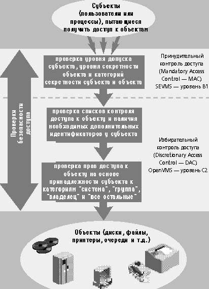 OpenVMS предоставляет два механизма контроля доступа к объектам: списки контроля доступа (Access Control List — ACL) и средства задания прав доступа к каждому объекту для четырех категорий: система (system), группа (group), владелец (owner) и все остальные (world).