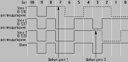 Более интересным и, как все миниатюрное, изящным представляется использование идентификаторов в качестве основного инструмента, используемого в процедуре разрешения коллизий. По определению CSMA станция имеет право начинать передачу, если эфир свободен, и при хорошей скорости передачи и небольшом числе станций так чаще всего и бывает. Но неизбежны случаи, называемые коллизиями, когда две или даже большее число станций начинают одновременно работать в эфире. В CAN в качестве основного критерия для разбора коллизий, для принятия решения, кому отдать эфир, используется приоритет сообщений. Каждому типу сообщения приоритет присваивается во время проектирования системы и динамически изменяться не может. Приоритет выражается двоичным значением идентификатора: чем число меньше, тем выше приоритет.