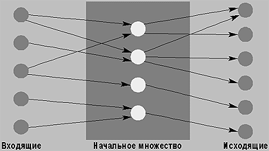 | Рис. 3. Начальное множество и соседние страницы. При подходе, использующем «входящие ссылки» начальное множество страниц расширяется за счет соседей, которые представляют собой набор документов, связанных гиперссылками с документами в начальном множестве |