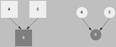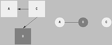 | Рис. 2. Множество Web-страниц и соответствующий граф коцитирования. Если Web-страница C ссылается на страницу A и страницу B, тогда A и B связаны в графе ненаправленным ребром, и говорят, что они коцитируются на C |